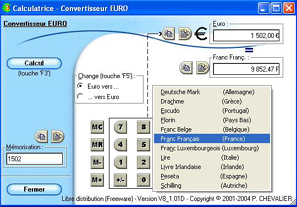 Fonctions basiques d'une calculatrice avec l'affichage de l'ensemble des opérations. Le convertisseur Euro supporte 11 pays. Fonctions de mémoire et de copier-coller.